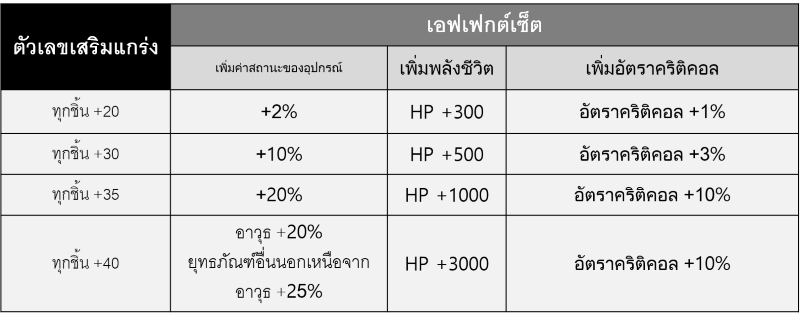 4. เมื่อค่าเสริมแกร่งของยุทธภัณฑ์ทุกส่วน +20 ตัวละครจะได้รับเอฟเฟกต์เซ็ตตามตารางข้างต้น