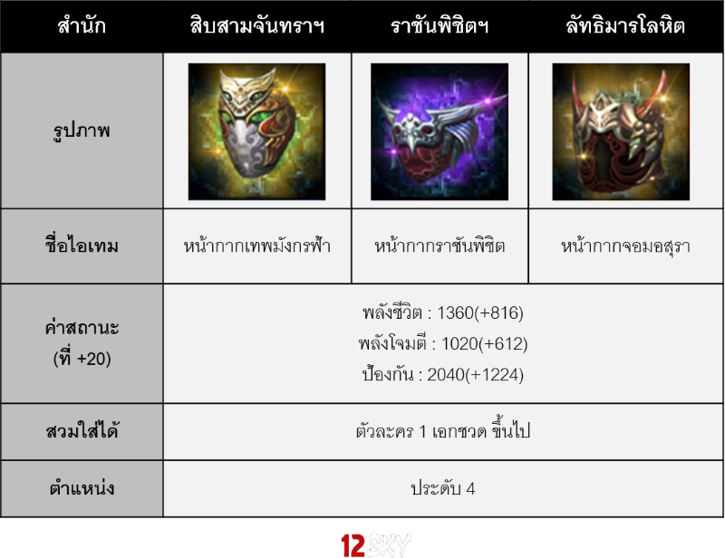ㆍหน้ากากที่จะได้รับจากกล่อง จะมีค่าเสริมแกร่งแล้วที่ +20 (ท่านสามารถนำไปเสริมแกร่งต่อไป)